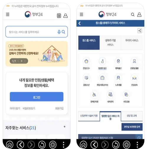 1) 정부24 앱 설치 스마트폰에서 구글 플레이스토어나 애플 앱스토어에 접속해 정부24 앱을 다운로드합니다.