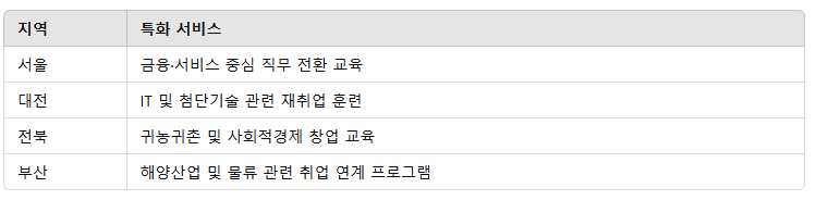 예를 들어, 대전은 IT 교육 중심, 전북은 귀농귀촌 및 사회적 경제 창업에 특화되어 있으며, 부산은 해양·물류 산업 중심 프로그램을 제공합니다. 이를 통해 중장년층이 지역 내 실질적인 취업 기회를 얻고, 현장에 바로 투입될 수 있는 실무 역량을 키울 수 있도록 지원합니다.