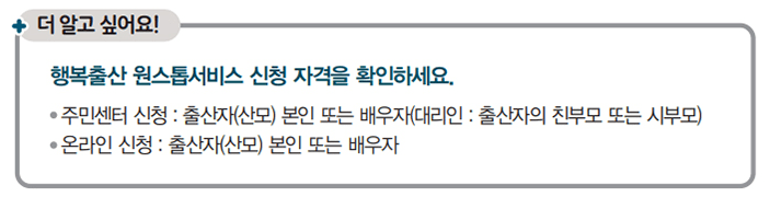 | 지자체 개별 서비스 | 출산지원금, 다둥이카드, 출산· 축하용품 등 ※ 지자체에 따름 |