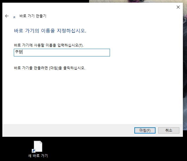 4. 다음 창에서 이름을 쿠팡이라고 한글을 넣어줍니다. 마침을 누릅니다.