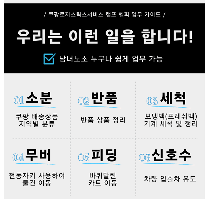 주부님들이 사회 경력단절 되어 다시 일하기 힘들어하시는데 쿠팡을 한번 도전해 보시길 바랍니다. 현실적으로 투잡을 찾거나 소일거리를 원하는 분은 쿠팡을 많이 찾습니다.