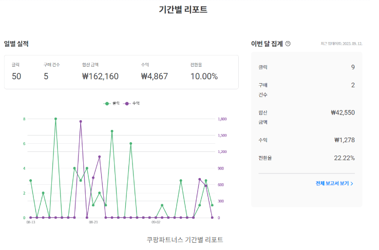 그런데 쿠팡파트너스는 글을 10개 이상 썼을 경우 시간이 지날수록 수익이 쌓입니다.