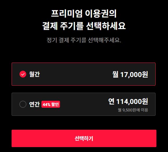 월 17,000원으로 동시에 4명이 접속 가능합니다. 프리미엄답게 4K 화질로 다양한 서비스를 이용할 수 있습니다. 연간 이용권 결제 시 44% 할인을 받을 수 있으며, 사실상 월 9,500원으로 이용이 가능합니다.
