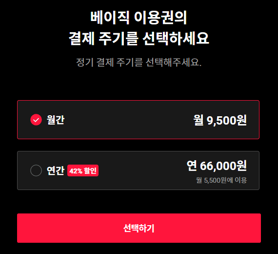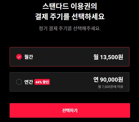 월 13,500원으로 동시에 2인이 접속가능하며 1080P화질입니다. 모든 디바이스에 연결이 가능하며 연간 이용권을 구매하면 연 90,000원으로 월 7,500원으로 이용이 가능합니다.
