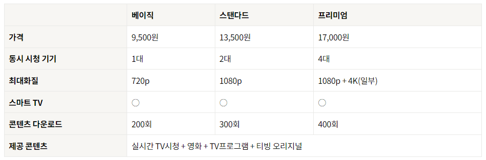 | 프리미엄 | 높은 화질도 중요하며 4명 이상 동시접속 가능 |