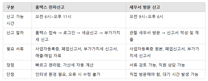 폐업 부가세 신고는 국세청 홈택스를 통한 전자신고와 세무서 방문 신고 두 가지 방법으로 진행할 수 있다. 각 방법의 차이점을 비교하면 다음과 같다.