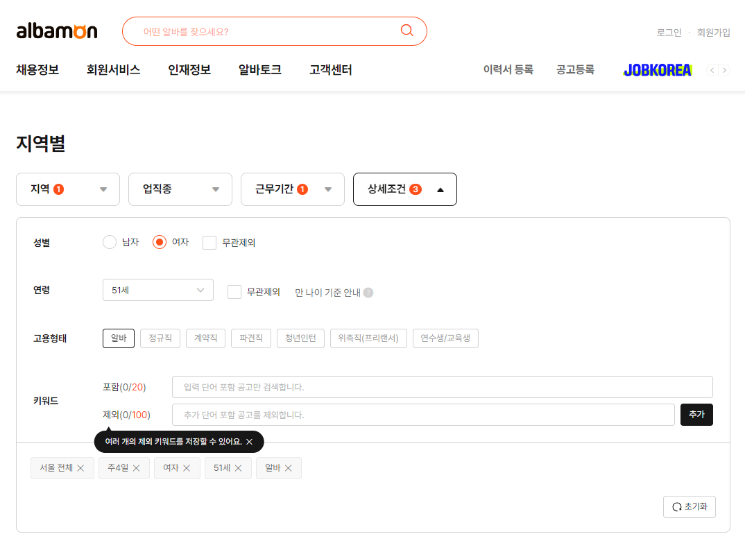 알바몬은 다양한 연령층을 대상으로 일자리 광고를 올리는 사이트입니다. 10대부터 다양하게 60대까지 폭 넓게 일자리를 구할 수 있습니다. 주부의 현실적인 시간을 제외하고 주에 6일, 혹은 5일, 3일, 그리고 파트타임 시간까지 정해 일자리를 구할 수 있습니다.