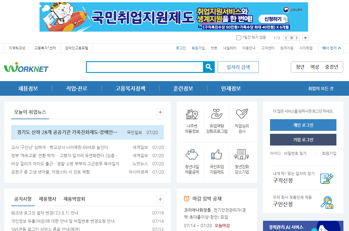 고용보동부 주관 하루 방문자 1백만 사이트입니다. 실업급여를 타는 분만 이용하는 것으로 알고 계신데 일반인도 일자리를 구할 수 있습니다. 또한 2030분 보다 4050분이 많이 이용하는 곳입니다. 워크넷은 주로 정규직 채용이 우선으로 하지만, 다른 것도 얻을 수 있으니 숙지하시길 바랍니다.
