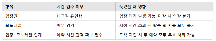 결론부터 말씀드리면, 입장권은 약간의 시간 지연은 허용되지만, 모노레일은 시간 엄수가 절대적이며, 변경·환불이 불가합니다. 아래에서 항목별로 구체적으로 알아보겠습니다.