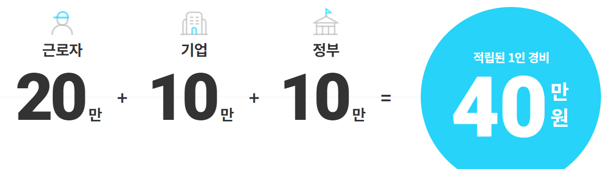 근로자가 20만 원을 내면 회사에서 10만 원, 그리고 정부에서 10만 원으로 총 40만원이 적립됩니다.