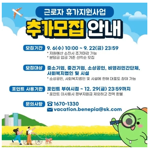 근로자 휴가사업은 직장 내 자유로운 휴가 문화 조성과 국내여행 활성화를 위해 정부와 기업이 함께 근로자의 국내여행비를 지원하는 사업입니다. 조기 마감된 지원금 재신청 가능하니 다음 링크로 신청하시길 바랍니다.