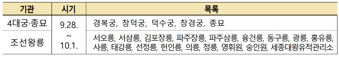 4대 궁, 종묘 및 조선왕릉이 9.28~10.1로 경복궁, 창덕궁, 덕수궁, 창경궁, 종묘, 서오릉, 서삼릉, 김포장릉, 파주장릉, 파주삼릉, 융건릉, 동구릉, 광릉, 홍유릉, 사릉, 태강릉, 선정릉, 헌정릉, 의릉, 정릉, 영휘원, 숭인원, 세종대왕유적관리소등 무료개방합니다.