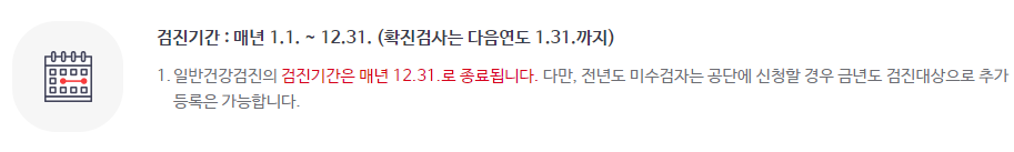건강검진 기간은 당해연도 1월 1일부터 12월 31일까지입니다. 다만 전년도에 검진받지 않은 일반인 대상자의 경우 공단에 직접 전화신청 시 금년도 대상자로 추가등록이 가능합니다.