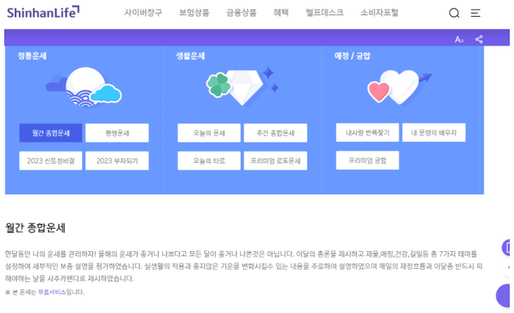 신한라이프 운세는 어려운 시기 스트레스를 겪을 때 운세를 통해 긍정적인 에너지나 희망을 얻고자 할 때 위안이 된답니다. 2023년 신토정 운세로 들어가면 월 별 운세도 같이 볼 수가 있답니다. 때로는 작은 결정을 내리기 위해 운세를 참고하는 경우도 있습니다.