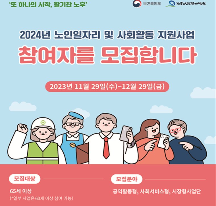 - 2024년 노인일자리 역대 최대 폭인 14.7만 개 확대한 103만 개 제공-