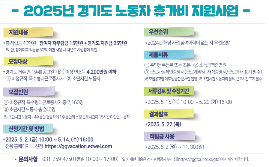 짧은 투자로 여유로운 여행과 휴식을 누릴 수 있는 기회! 2025 경기도 노동자 휴가비 지원사업을 놓치지 마세요.