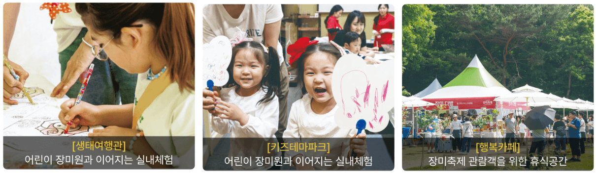 장미원에는 265개 품종, 약 5만7천여 본의 다양한 장미가 식재되어 있으며, 야외 결혼식과 소공연이 가능한 이벤트 마당도 마련되어 있습니다.