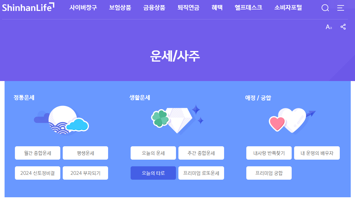 신한생명 정통운세는 하루, 한 달, 일 년 단위로 운세를 제공할 뿐만 아니라, 연애, 직업, 재물 등 다양한 분야에서의 운세를 분석해 줍니다.