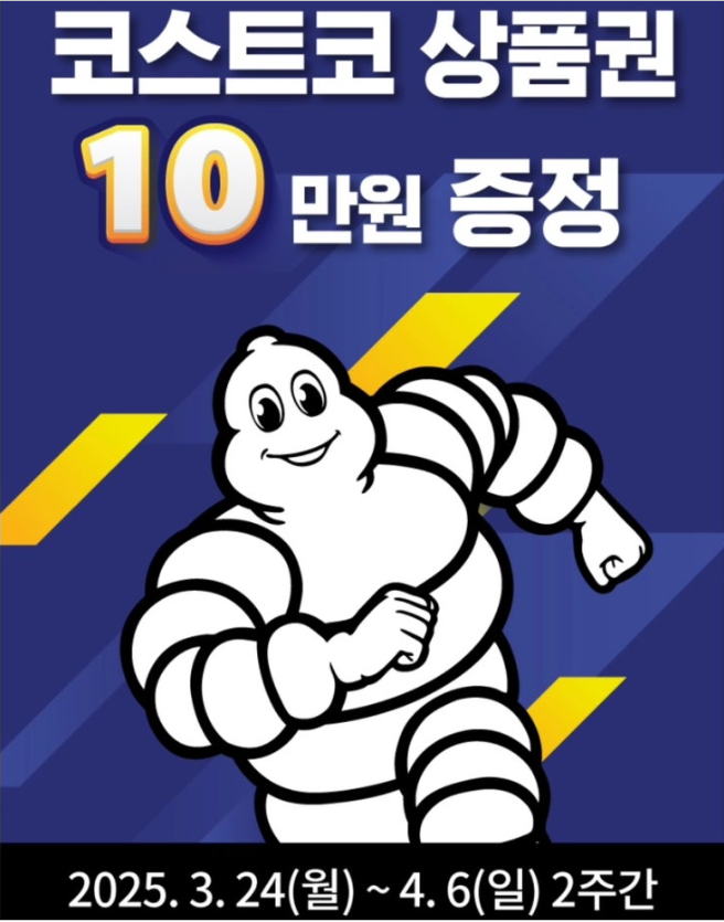 2025년 3월 24일(월)부터 4월 6일(일)까지 총 2주간 진행되는 이번 이벤트는 전국 코스트코 타이어 센터와 온라인몰에서 동시에 적용되며, 행사 기간 내 구매 및 장착을 완료해야 상품권 혜택을 받을 수 있습니다.