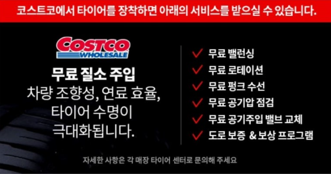 - 장착은 반드시 코스트코 타이어 센터에서 직접 진행해야 하며, 택배 배송만으로는 혜택 적용이 불가합니다.