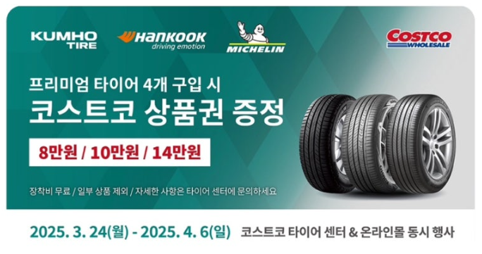 - SUV 또는 프리미엄 타이어 4개 구매 시: 코스트코 상품권 14만 원