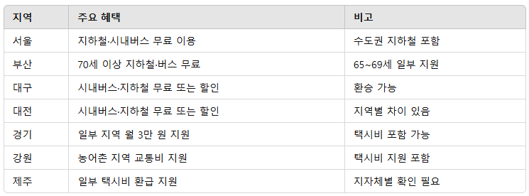 - 서울, 부산, 대구, 대전 등은 해당 지역 내에서만 무임승차 혜택 적용