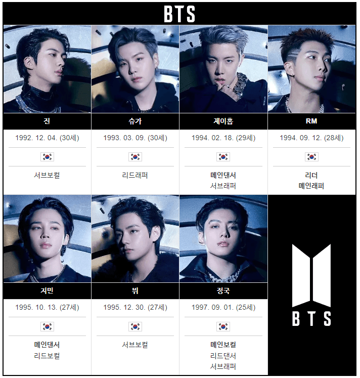 멤버 RM, 슈가, 지민, 진, 정국, 뷔, 지민