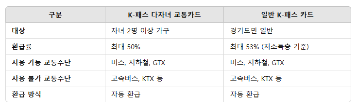 1. 대상: 다자녀 교통카드는 자녀 2명 이상 가구, 일반 K-패스는 경기도민 전체 대상