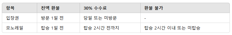 - 모노레일은 시간 엄수 필수: 미탑승 시 환불 불가, 변경 불가
