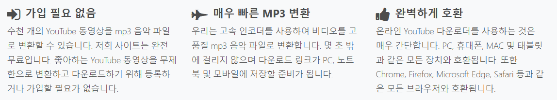 | 장점 | url을 입력 후 원하는 형식으로 다운로드 최대 1FB/s 빠른 전송 속도 무료로 무제한 다운로드 및 오디오 지원 별도의 가입이나 요금 필요없음 |